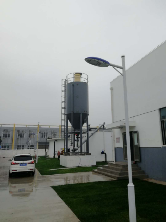 干粉投加裝置使用原料由散裝粉料專用密封罐車給料,通過快接式DN100進料口將粉末輸入倉內(nèi)并儲存,經(jīng)過氣動破拱及震打疏松計量給料。疏松的石灰粉末經(jīng)過螺旋輸送機投加至石灰乳溶解池計量投加至加藥點。該裝置設(shè)有除濕裝置,確保倉內(nèi)保持恒溫干燥,不易使石灰粉末有架橋現(xiàn)象,從而保證粉末疏松給料。料倉設(shè)有高、中、低料位計。高位報警時則提示粉料倉內(nèi)粉料已投滿;中位報警時粉料倉內(nèi)粉料已欠缺,則提示工作人員需補充進料;低位報警時則警示粉料倉已缺料,即整套系統(tǒng)裝置將處于停機狀態(tài);倉內(nèi)進料時先開啟倉頂除塵器,因為石灰粉末入倉時會產(chǎn)生粉塵,對周圍環(huán)境及操作人員的身心健康造成影響和不便。因此本裝置中采用倉頂式除塵器來收集、除塵。吸咐在濾袋表面的粉塵由壓縮空氣振蕩,下落于粉料倉內(nèi)。進料結(jié)束時,待延遲一段時間后關(guān)閉除塵裝置的壓縮氣源。